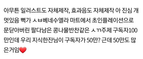 아무튼 일러스트도 자체제작, 효과음도 자체제작 아 진심 개멋있음 뻑가 ㅅㅂ베네수엘라 마트에서 초인플레이션으로 문닫아버린 팔다남은 콩나물반찬같은 ㅅㄲ주제 구독자100만인데 우리 지식한잔님이 구독자가 50만? 근데 50만도 많은거임❤