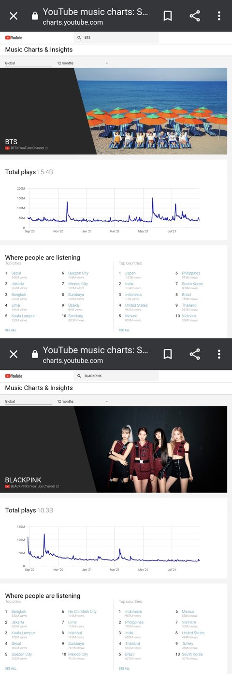 팔로워가 블핑이 젤 많아도 수익이 방탄보다 훨 낮은건 미국 일본이랑 태국 베트남같은 동남아랑 유툽 1조회수당 단가가 10배이상 차이나서임 방탄은 작년올해 유툽 시청 1위 국가가 일본이었고 블핑은 인도네시아였음