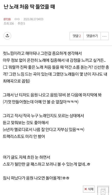 진짜 2주동안 눈막귀막하고 티저영상 스밍만 돌리다가 오늘 6시 땡 하자마자 음원 듣고 그동안 참은거 보람 느낌ㅎㅎ