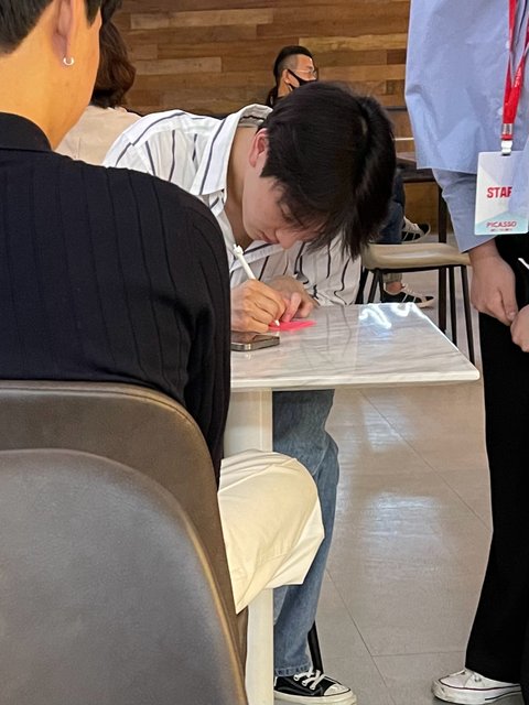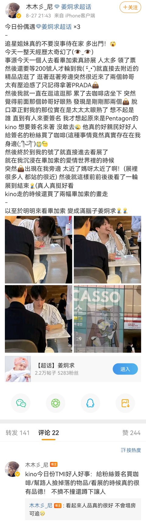 키노가 본인이 정말 잘생겼어요.떨어진 물건을 주워줬어.전람회를 볼 때 매우 예의가 있다.팬들에게 커피를 사다 주다 너무 착한다