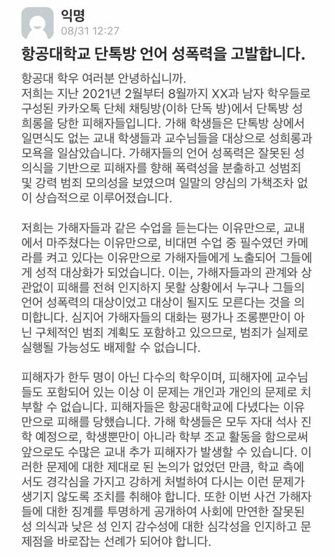 항공대 단톡방 언어성폭력을 고발합니다