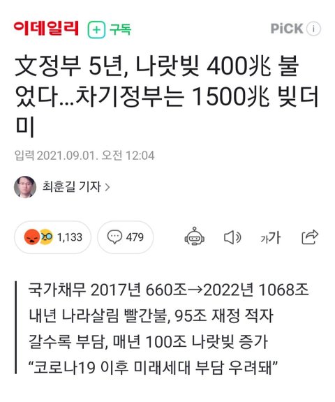 문재인 정권 5년 만에 나랏빚 무려 400조가 더 늘어남