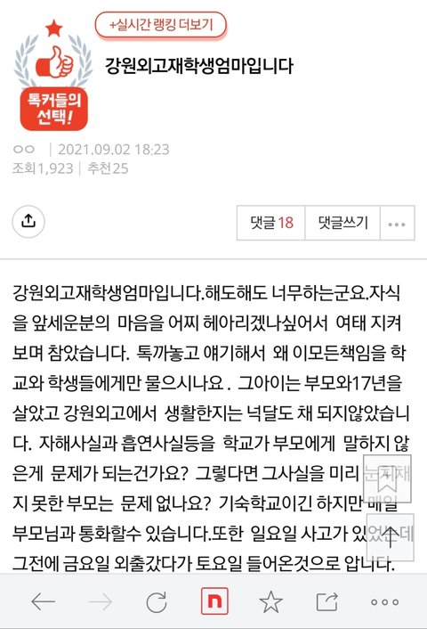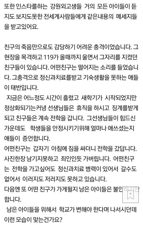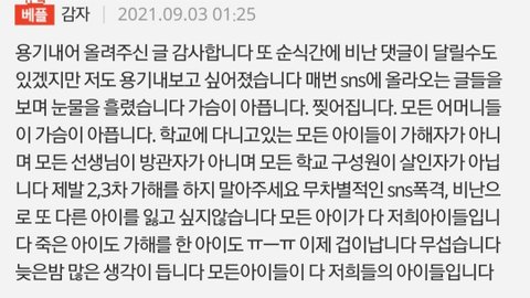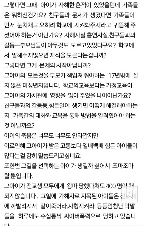 학교폭력으로 별이 된 아이보다 가해자로 지목받는 아이들의 사이버폭력이 더 심하다는 강원외고 학부모. 전교생에게 왕따당해봐야 400명밖에 안된다고...남은 아이들이 떠난 아이보다 열배백배 힘들다고 함. 좌표찍어 이 글 올려놓고 동조댓글들 캡쳐해서 피해아이 어머니께 DM보냈다고 함.