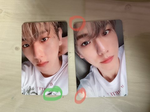 이거 두개 각각 다른분한테서 양도받은건데 왼쪽이 짭이라고 생각되거든?? 오른쪽 포카는 모서리에서 포카 뜯은 자국 딱 보이는데