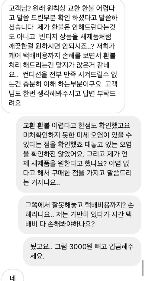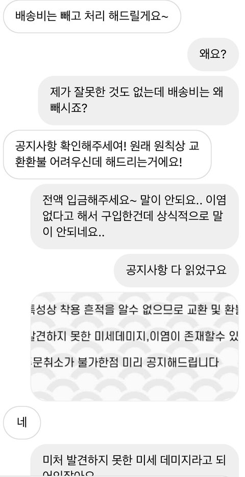 처음에는 환불 안된다고 하길래 따졌더니 환불 원래 안되는데 해주겠다는 듯이 선심쓰는 듯이 말하길래 짜증났지만 그냥 넘어갔어요. 근데 갑자기 배송비 빼고 환불을 해주겠대요. 거짓말하고 하자있는 상품 보내줘놓고 자기네들이 왜 손해를 봐야하냐고 하네요.