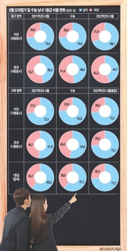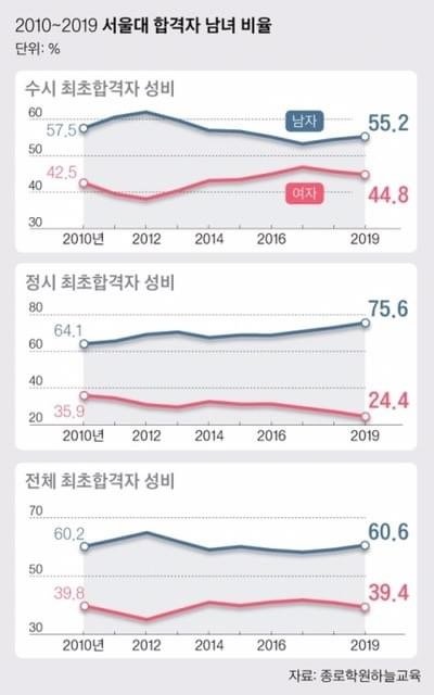 -입시에서 유의미한 수능 상위권은 남자가 우세. 최상위권 대학 신입생 비율만 봐도 남성이 압도적.