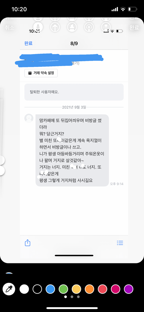 몇일 후 또 다른 계정으로 재가입해서 거래약속 잡아 거래장소에 나오게하더니 본인은 안나오고 또 밑의 사진처럼 욕하고 탈퇴하더라구요. 여기까지만 해도 진짜 정신병자한테 잘못 걸렸구나 하고 같은 피해자 없길 바라며 동네 맘카페에 캡쳐한 대화내역과 피해사실을 올렸더니 또 거기서 발작 버튼이 눌렸는지 집앞 도어락에 음식물 테러를 하고갔습니다.