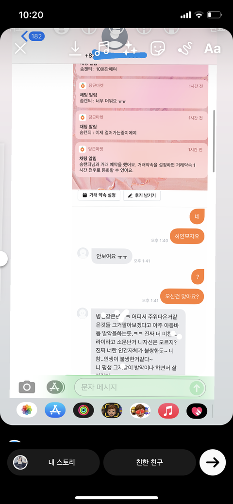 그랬더니 왜요?? 하며 또 하루종일 귀찮게 하길래 분명 새옷이고 가격제안 안된다고 해놨는데 자꾸 그런 질문하니 당연히 안팔고싶지 않겠냐 채팅 그만보내라. 하니까 또 짜증나 짜증나 짜증나 거리면서 하루종일 도배를 하더군요. 당근마켓은 거래약속 잡았다가 취소한 상대방은 차단도 안돼서 참다참다 당근거지냐 정신 나갔냐 대화그만보내라 했더니 거지라는 말이 발작버튼이었는지.. 거지는 너다, 니가 주워온 옷 파는거 아니냐며 입에도 담지못할 쌍욕을 막 보내더군요. 당근 마켓은 일처리도 참 느려서 그 다음날이나 저사람은 욕설 신고 누적으로 정지되어 탈퇴했습니다. 그리고 끝나는가 싶었는데