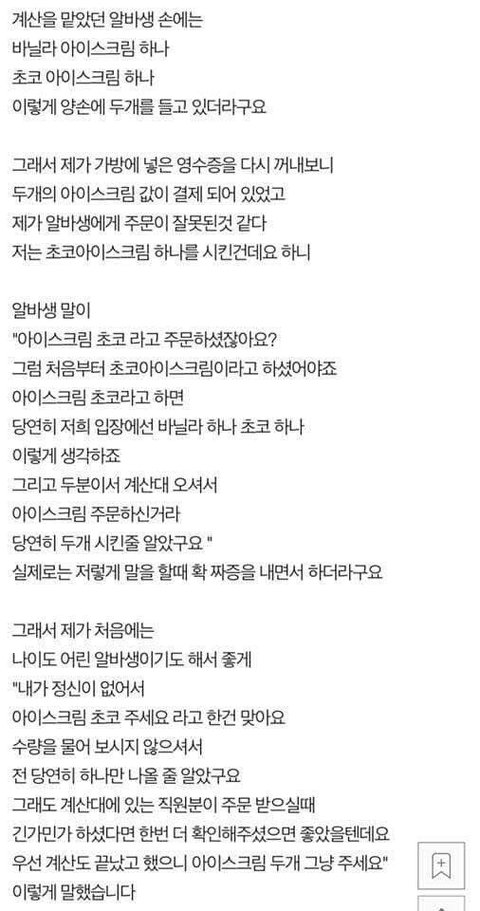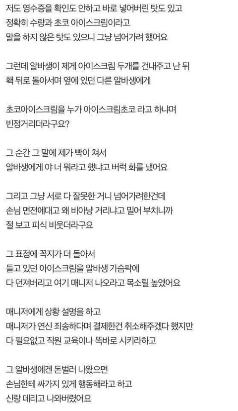왜 아이스크림초코가 바닐라1,초코1을 말하는건지 납득이 안가. 아이스크림 내던진건 잘못했지만 결과적으로 저런 싸가지없는 인간은 서비스직으로 일하면 안된다고 생각함.