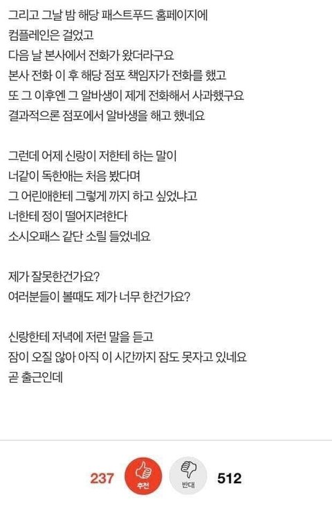 아니 이건 아이스크림만 안던졌으면 100% 알바잘못 아님??? 꼬여서 손님 무시하는거잖아 아이스크림초코라고 했다고 누가 두개로 알아들어 두개 시킬거면 애초애 아이스크림초코 두개주세요 했겠지? 그리고 자기가 주문받는 사람이면 확인을 했어야지 왜 안함? 결과적으로 자기가 주문 실수했는데 미안하다고도 안하고 따지고 비웃고 나같아도 화냈음 화안내면 호구지 근데 아이스크림던졌을때부터 쓰니가 선 넘은거임 그거만 안했으면 난 무조건 쓰니편이었을 듯