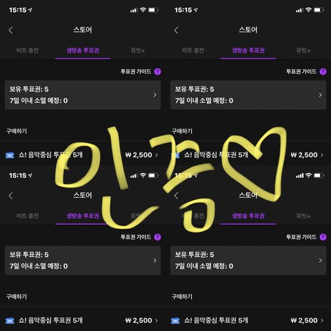 화면이 다 똑같이 생기긴 했는데 ㅋㅋㅋㅋ 계정 4개로 맨날 하트비트 모아서 20개 샀다! 계정 더 만들어서 더 살걸 ㅠ 다른건 몰라도 음악중심인데!!!! 꼭 1등하자!!!!!