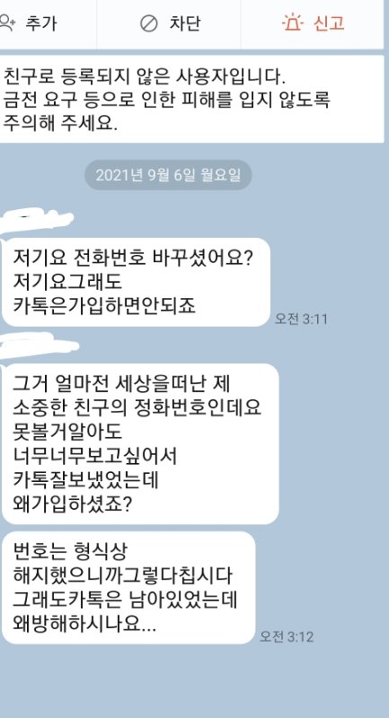 지금 새벽인데 ㅅㅂ 갑자기 저렇게 카톡옴 아니 어제 전번 바꾸고 당연히 카톡도 번호 바꿨거든? 그래서 저거 뭐라는거야 무서움 그냥 이상한 사람인가