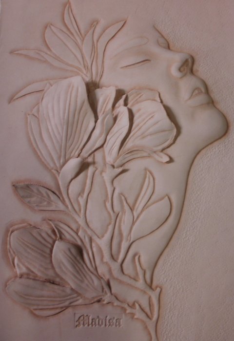 가죽에 인물과 목련 디자인을 3D카빙(가죽 입체 수조각)하였습니다.(마디샤가죽공예)