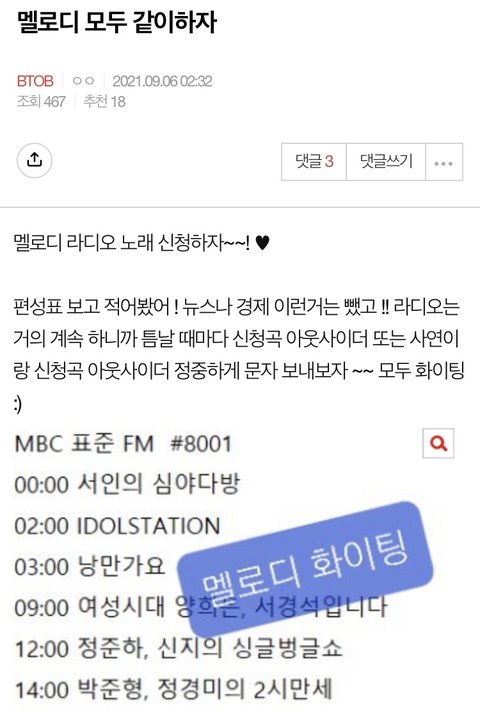 음방 1위를 위해 방송 점수 얻자!! 밑에 다른 멜로디가 써준 글 참고해주랑 앞부분만 캡처해옴! 문자 이용료 얼마 안 나오긴 하지만 어플 kong, 고릴라, mbc 라디오 들어가서 실시간 댓글 달아도 됨