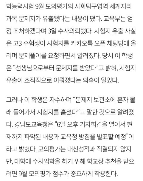 담임이 준게 아니라 애가 시험지 훔쳐온거임...옾챗에서는 담임이 줬다 했는데 수사 시작하고 일커지니까 자수했나봐