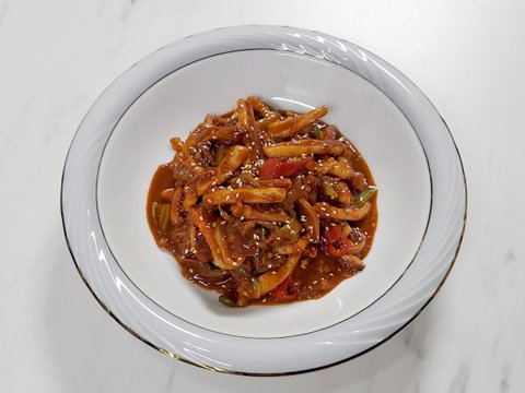 흰쌀밥에 얹어 덮밥으로 매콤 달달하게 맛있게 먹었어요! (오징어순대를 못한 게 아쉽긴 했지만)