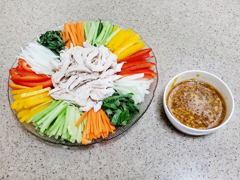 질리실까 봐 메인만 닭가슴살로 바꿔서 해드렸더니 여전히 잘 드셨던 닭가슴살겨자냉채!(뿌듯)