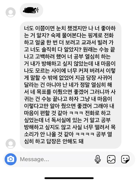 참고로 우리 학년 확진자 나와서 학교 안감… 그리고 이미 둘다 서로 좋아하는거 눈치 깠었음 수능 끝날때까지 눈치게임만 할줄 알았는데 얘가 고백해벌임…! ㅋㅋㅋㅋㅋㅋㅋㅋ아행복해