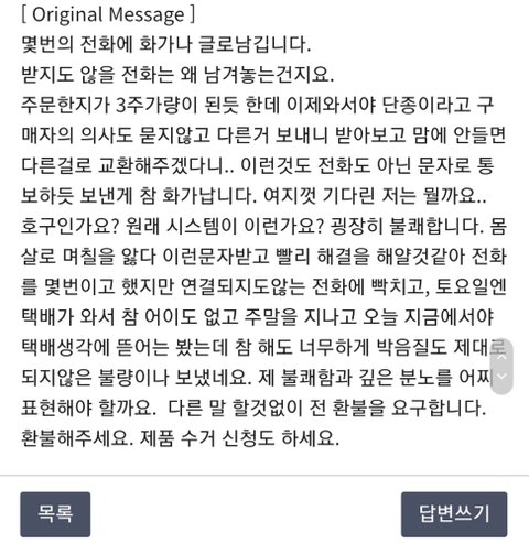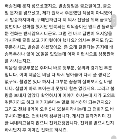 내가 기다린게 20일인데, 내가 주문했던것도 아니고, 구매의사를 밝힌것도 아니고, 전화를 해도 안받더니, 기껏 보낸게 불량이라 너무 화가 치밀어올라서 바로 쇼핑몰에 제 분노를 걸러 담아 환불요구 글을 남겼습니다.