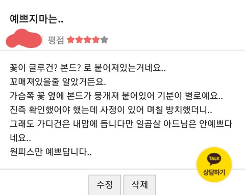 해외발송이라해 원피스 하나와 가디건은 선발송되어 8월 20일쯤 받았는데 며칠 방치했다 뜯어보니 가디건에 달려있던 꽃장식이 박음질이 아니라 글루건으로 부착한 형식이어서 당황스러웠고, 그 옆으로 글루건이 뭉개져 있어서 좀 기분이 좋지않았어요.