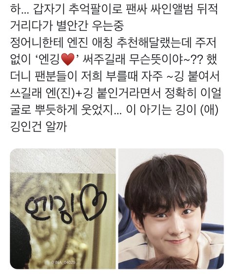 엔깅이랰ㅋㅋㅋㅋㅋㅋㅋㅋㅋㅋㅋ우리가 엔하이픈 보고 깅이라고 자주 불러서 정원이도 엔진에 깅 붙여서 엔깅이라고 추천해줬대ㅜㅋㅋㅋㅋㅋ 아무튼 우리 엔깅이야