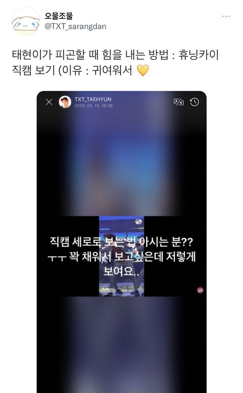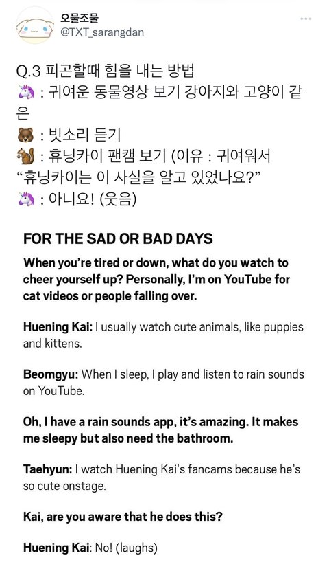 여기 오물조물님이 전부 번역해주셨다! 태현이더 진짜 닝둥이얔ㅋhttps://twitter.com/txt_sarangdan/status/1151062127248986112?s=21