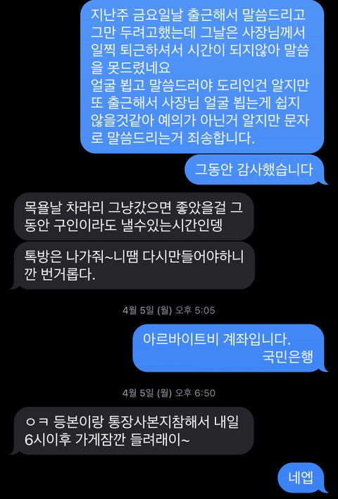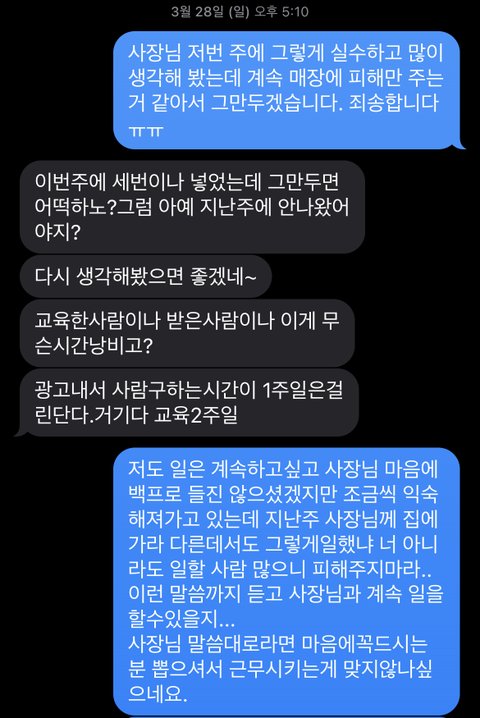 일이터진 그날. 유독 바빴어. 근데 내가 일을 시작한지 한달도 안돼서 조금 헷갈리고 정신이 없어서 실수를 또 했는데 갑자기 사장이 주방안에서 엄청크게 야!!!이러면서 소리지르고 이렇게 일할꺼면 집에가라고 하길래 일단 죄송하다 하고 계속 일을했지. 그러고 몇분뒤에 갑자기 진지하게 그냥 지금 집에가라면서 나때문에 자기 매장에 피해본게 얼만줄 아냐고 나처럼 일해서 돈 못 받고 나간사람들 많다면서 남의 돈 벌기가 쉬운줄 아냐 계속 뭐라하길래 그 자리에서 그냥 집에 오고싶었는데 참고 계속 일했다 근데 계속 뭐라하고 나보고 알바하기전에 뭘하고 오길래 항상 그렇게 힘들어보이냐면서 맥도날드 알바 할 때도 그렇게 했냐고 거기서는 뭐라고 안하더냐 묻길래 아무말 안한다고 하니깐 그러면 거기가서 일하라면서 그러더라. 그래서 혼자 아무리 생각해도 내가 엄청난 잘못을 한것도 아닌데 이런말까지 들어가면서 일하는게 너무 화나서 마감할때 사장한테 오늘까지만 하고 그만둔다고 할려고 했어. 11시 마감인데 10시쯤에 사장이 마감 잘하고 가라면서 하는말이 저번주부터 나 일하는거 보고 그만나오라고 할려고 했는데 불쌍해서 봐줬다면서 앞으로 잘하라고 그러고 집에갔어. 그러고 나서 집에 왔는데 너무 서러워서 계속 눈물이 나더라고.... 그래서 일 안하고 싶었는데 다음날에도 가기로 했던거라서 갑자기 안간다하면 뭐라할까봐 다음날 근무하고 이제 일 못하겠다고 문자 보냈는데 이렇게 답장이 왔어.