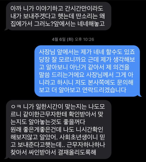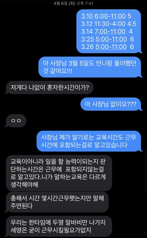 그래서 일이 잘 해결됐다 생각하고 한달동안 일한 알바비 보내달라고 했는데 등본이랑 통장사본들고 가게 들리라길래 갔더니 좋게 좋게 이야기하길래 알겠다 하고 일한시간 보내줬더니 교육한시간은 돈을 못주겠다더라고.... 그래서 내가 알기로는 교육한시간도 똑같이 줘야한다고 했더니 그거는 나를 쓸지 안쓸지 확인했던거라면서 돈을 안준다고 하길래 일단 그 자리에서는 말문이 막혀서 알겠다 하고 집에 왔어. 근데 내가 교육을 12시간을 넘게했는데 그걸 안받고 넘어가는건 너무 화가나서 말했더니 이렇게 문자가 왔어.