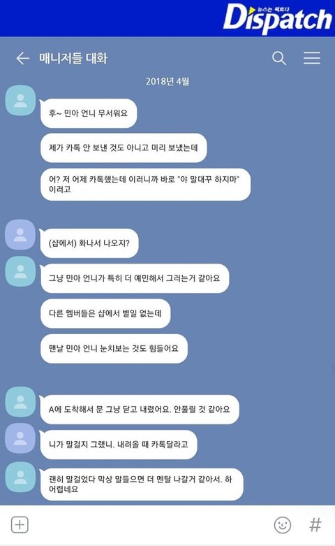 민아는, 지민이 두려웠다. “지민 언니에게 혼날까 봐 무서워서 말을 못했다”고 쓰기도 했다. 반대로 (어린) 매니저는, 민아가 무서웠다.
