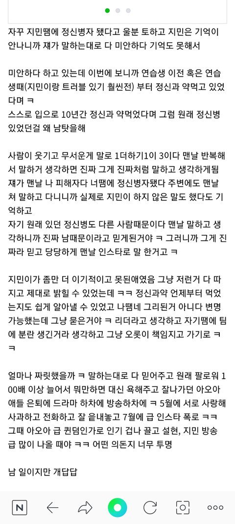 근데 초아도 탈퇴할때 지민만 언팔한거보면 지민이 사람대할때 좀 문제 있는것도 맞는거같음. (그렇다고 권민아가 말한것처럼 희대의 ㅆㄴ은 아닌듯)