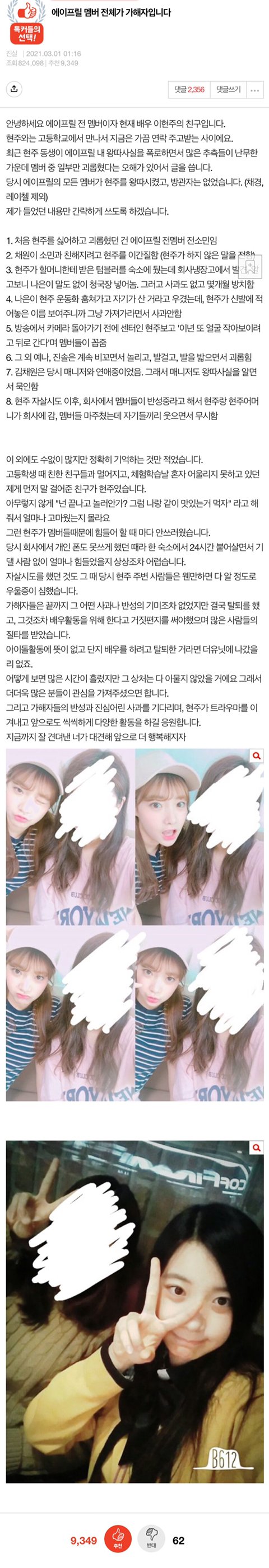 근데 새삼 네티즌들 진짜 개돼지같다... 저 말을 믿고 추천을 9000개 넘게 누른거봐ㅋㅋㅋ 상식적으로 말이 됨? 미자 시절 채원 매니저 연애도 연애인데 저 '음방 무대에서 센터였던 현주한테 '이년 얼굴 작아보이려고 뒤로가네''????? ㅅㅂ 뭔 쌍팔년도 여적여 소설이냐?? 음방 녹화 시작 전이면 다들 마이크 차고 있어서 작은 소리도 다 들릴테고 앞에는 팬들이랑 꼰대 그 자체인 피디들이 보고 있는데 신인 걸그룹이 퍽이나 그런 말을 했겠다ㅋㅋㅋㅋ 이걸 믿은 지능이 진짜 레전드ㅋㅋㅋㅋ