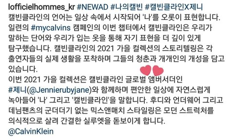 >> 블랙핑크의 멤버 제니가 아시아 국가 최초로 캘빈클라인 글로벌 앰배서더에 선정 <<