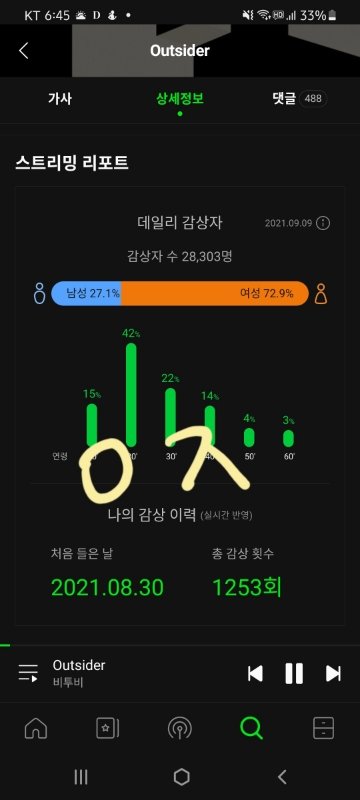 당연히 제일 중요한건 스밍이야 !! 다들 알고있을테고 잘하고있지만 최대한 안끊기게 조금만 더 신경써줘 나는 약간 끊겨서 저 정도인데 아마 이정도가 평균일거야 남은 음방 음원 반영비율
