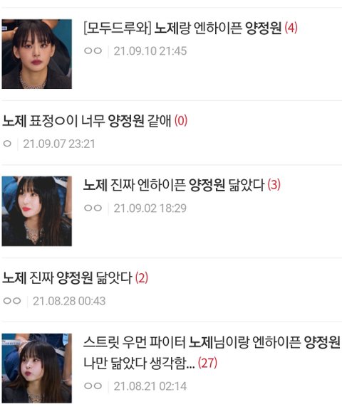 조카 웃김 양정원 닮았다고 한 것만 눈에 보이나 봄 노제 관련 닮은꼴 언급 이것보다 훨씬 많은데 왜 양정원한테 지랄이얔ㅋㅋㅋㅋㅋ양정원 팬들은 노제가 뭘하든 관심도 없어