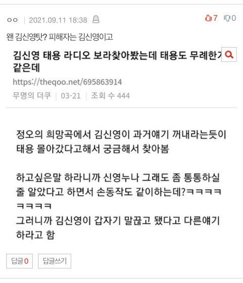 이외에도 태용팬들 사기피해자가 태용한테 패드립 먼저했다고 했는데 날짜 아예 다른 사람 갖고온거였고 태용이 먼저 한거 들통나서 타싸에서 개망신 당했는데도 아직도 유투브와 판에서만 날조중 ㄷㄷ 소름