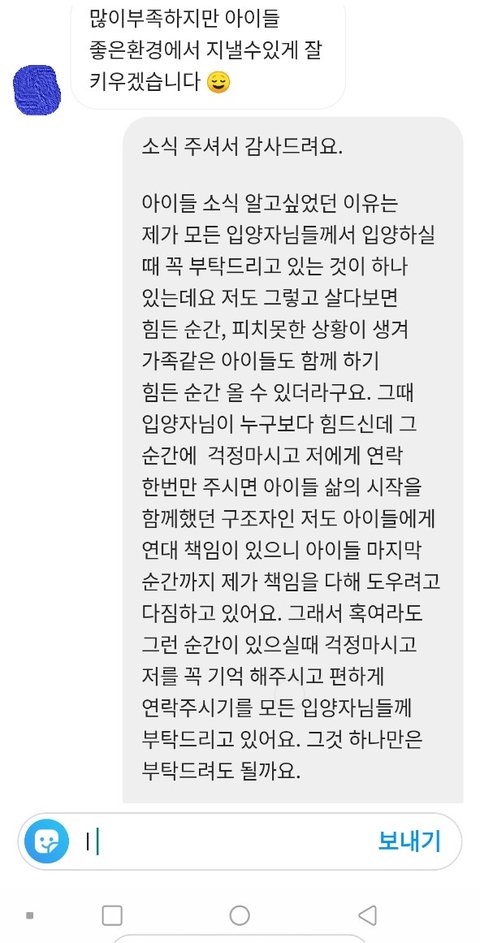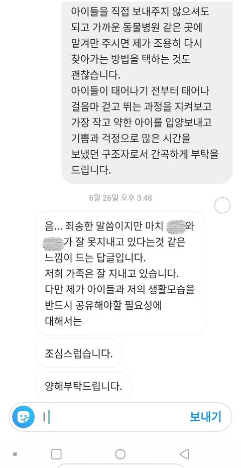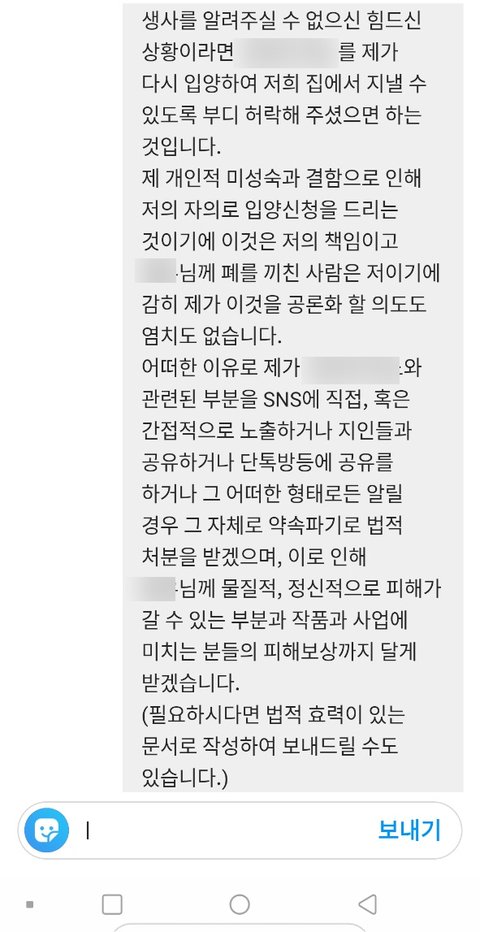 이 부분으로 입양 재검토를 요청하겠다고 보내자, 돌연 사과글과 함께