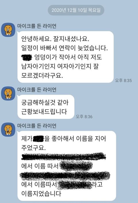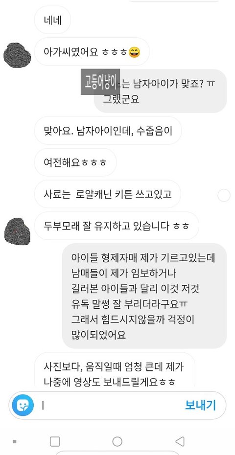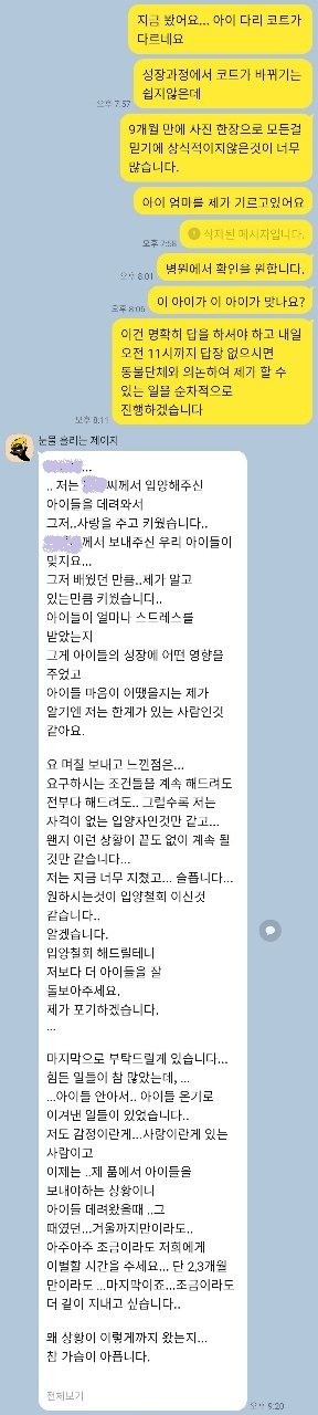 많은 분들이 제 쪽에서 '연락을 많이 하며 들들 볶았을 것이다.' 이런 말씀 하셔서 추가로 말씀드립니다.12월 4일 입양 하셨고 다음날 한 아이가 작아서 성별 식별이 어려운데 이 부분 확인이 필요할 것 같다 말씀드린 카톡 한번 드리고나서 4월 26일, 입양 후 처음으로 연락 드린 것입니다.
