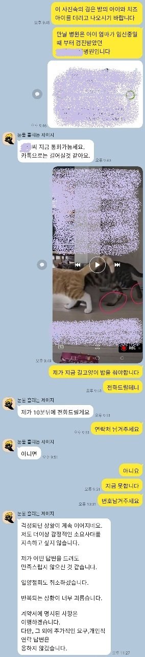 (바로 입양당시 알려준 번호로 전화를 걸었으나 계속 통화중이다가 나중엔 저를 차단한 상태)