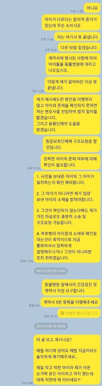 답이 없다가 한 시간 후인 밤 11시 반 다시 카톡이 와서 입양 철회를 취소를 할 것이며