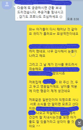 마지막에 혹시라도 아이들 기르시다 힘든 순간이 오면 저를 꼭 기억해주시고, 편하게 말씀해주시기를 부탁드렸으나 답은 없으셨습니다.