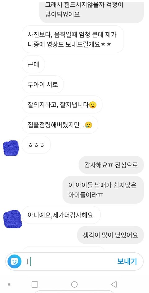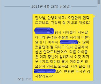 12월 10일 이 분이 연락주셨을때 (이 연락도 이 분께서 먼저 주셨고 제 쪽에서 소식 요청드리지 않았습니다.) 먼저 궁금하면 또 근황을 주겠다고 하셨지만 제 쪽에서 먼저 소식을 묻지 않았었고, 입양 후 거의 5개월이 다 된 시점 (12월 4일 입양, 4월 26일 제 쪽에서 연락) 에 처음으로 아이들 돌보는데에 어려움은 없었는지 안부 연락을 드렸습니다.