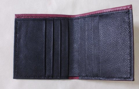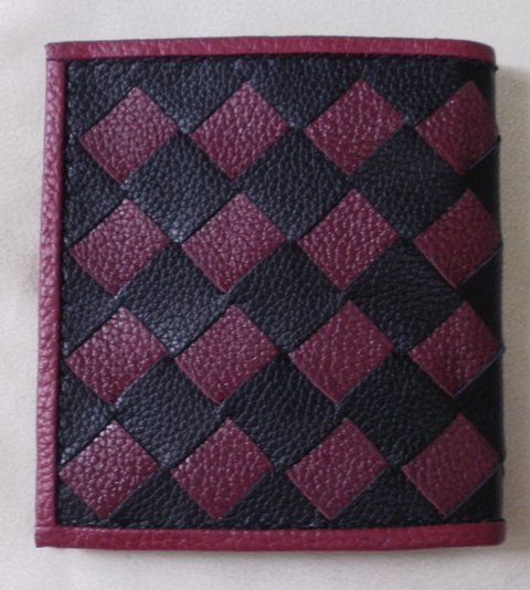오플 엠보싱 검정색 가죽과 자주색 가죽을 콜라보하여 엮은 메쉬 디자인 가죽으로 제작한 핸드메이드 가죽 중지갑입니다.(마디샤가죽공예)