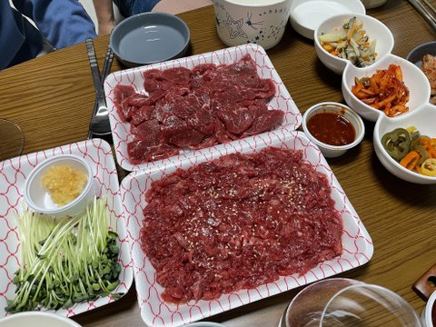 육회는 양념이 되어 나오고,
