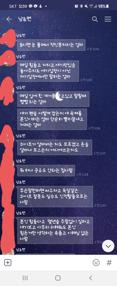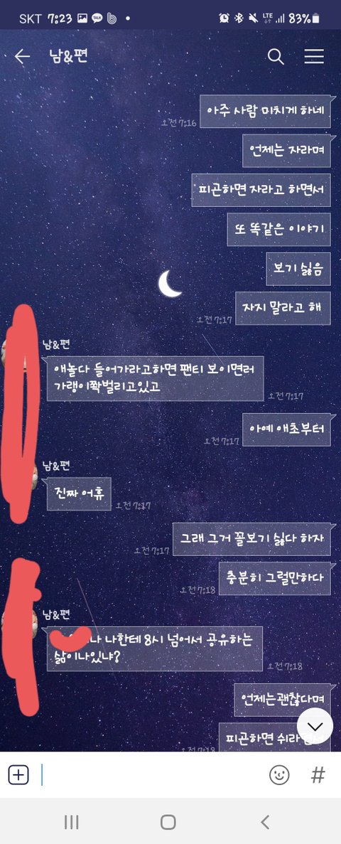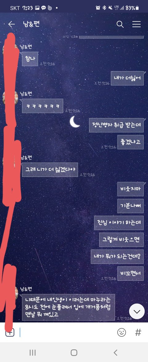 우는 아이를 데리고 방에 들어와서 토닥이면서 달래고 있는데 불을 켜고 들어와서는 아이에게 화를 내며 똑바로 앉으라고 니가 뭐가 불만인지 이야기하고 득달같이 달려들더군요 중재를 하려고 하니 니는 입에서 거품나온다고 더럽다면서 거울이나 보라고 하고..