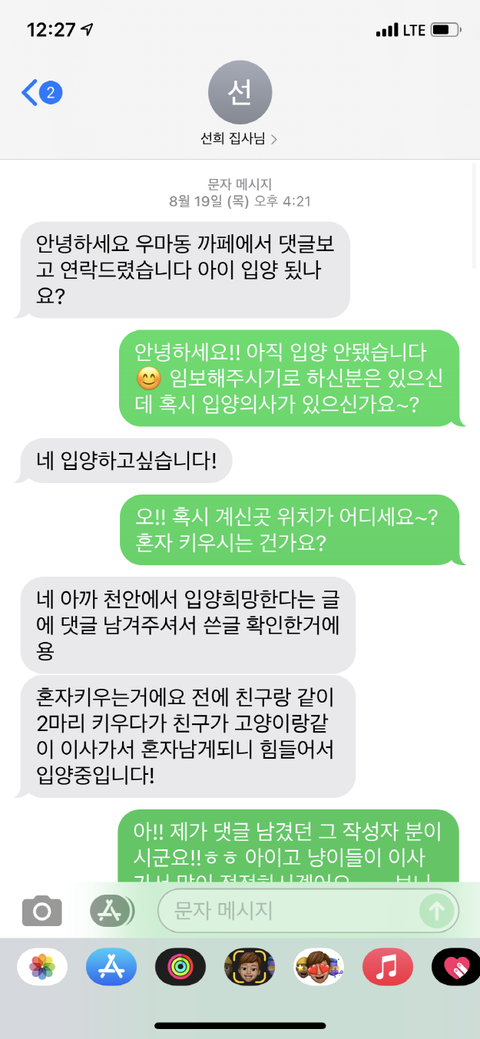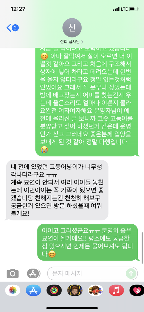 다음날 먼저 연락이 왔고 핸들링에 성공하고 있다며 고양이를 안고 있는 사진을 보내주었습니다. 그때부터 고양이가 좋은 분을 만나 다행이라는 생각을 하며, 의심을 내려놓았습니다.