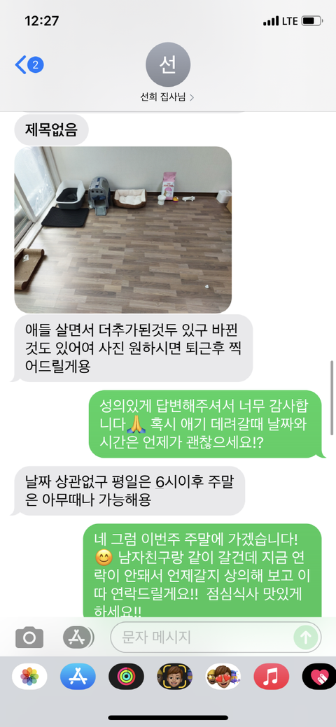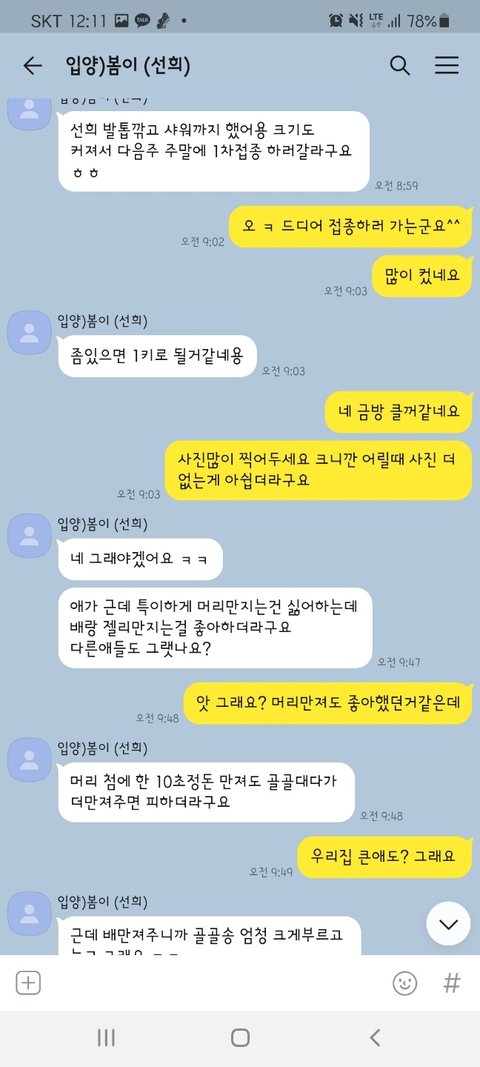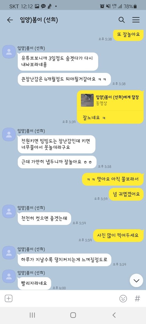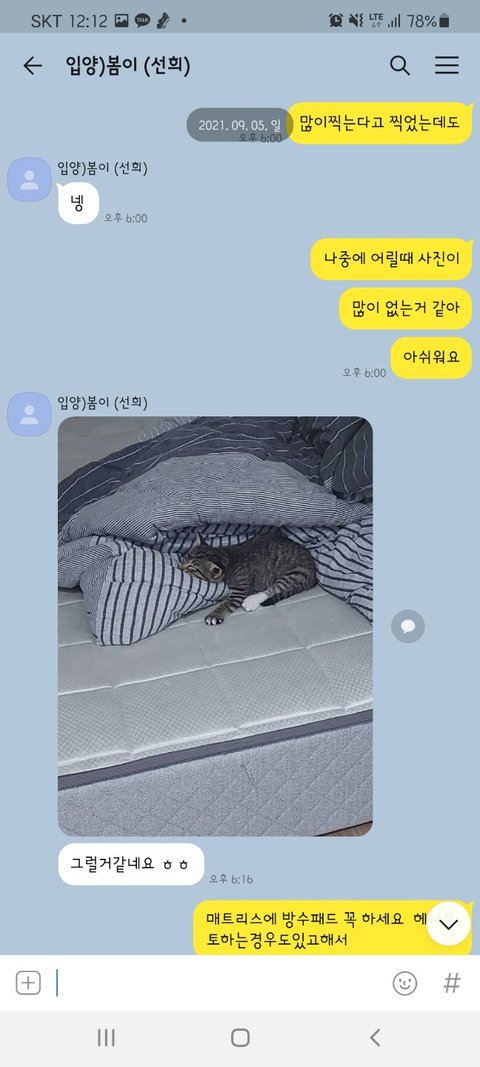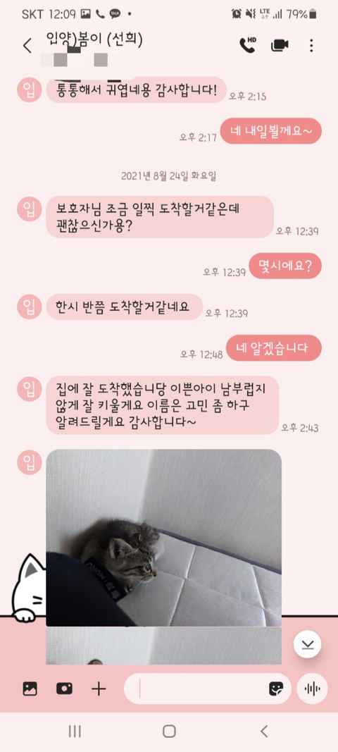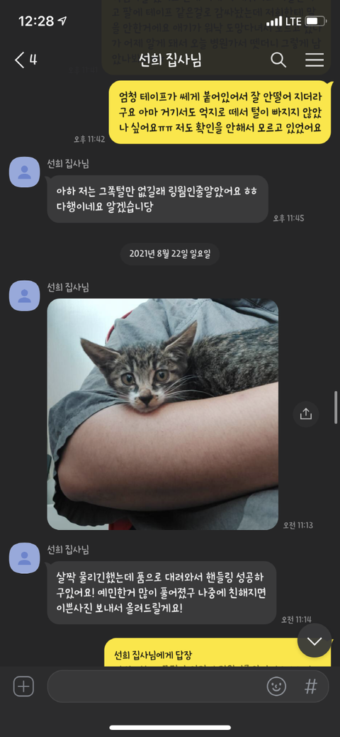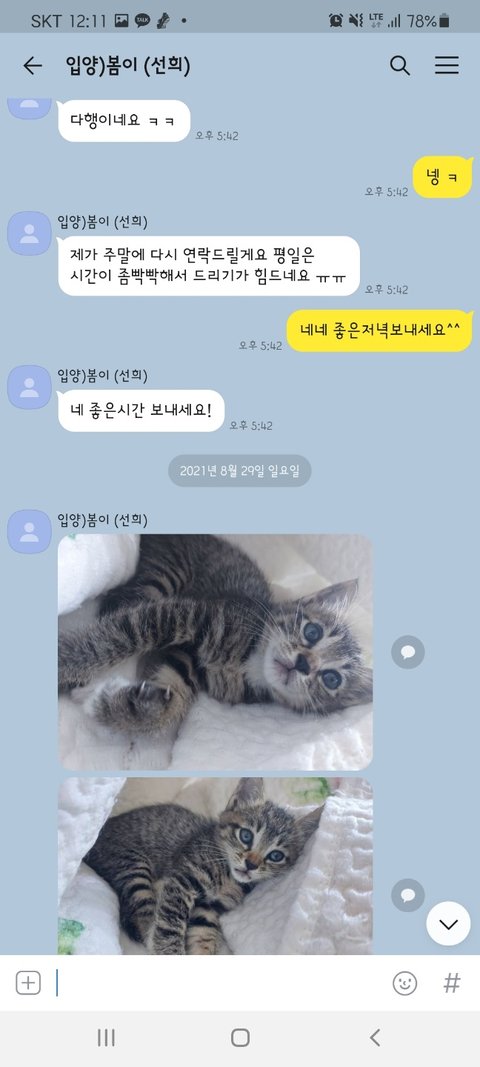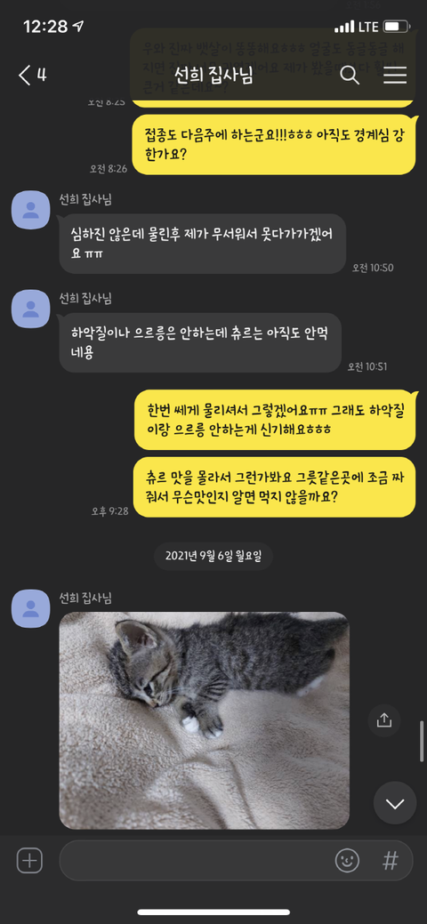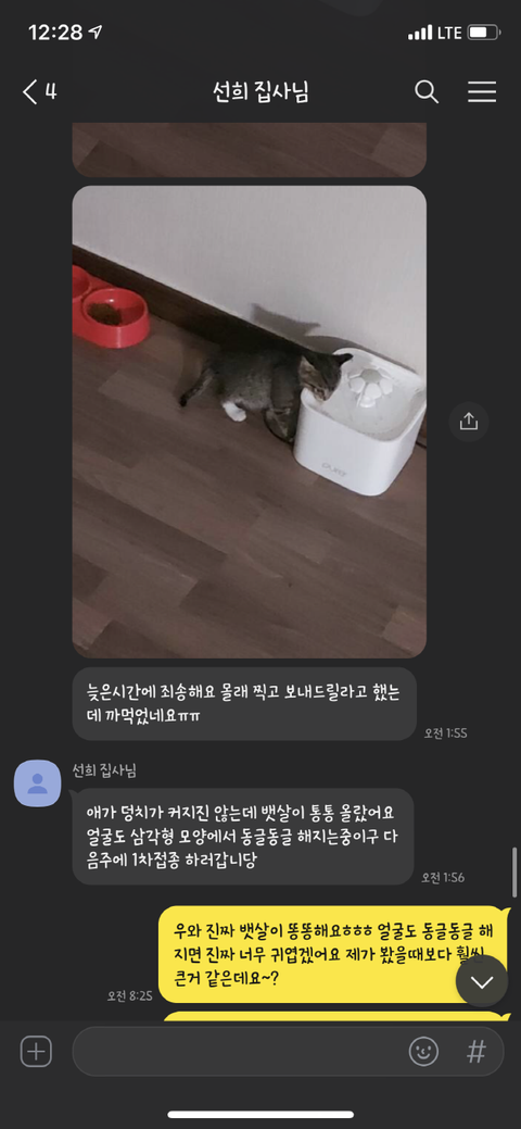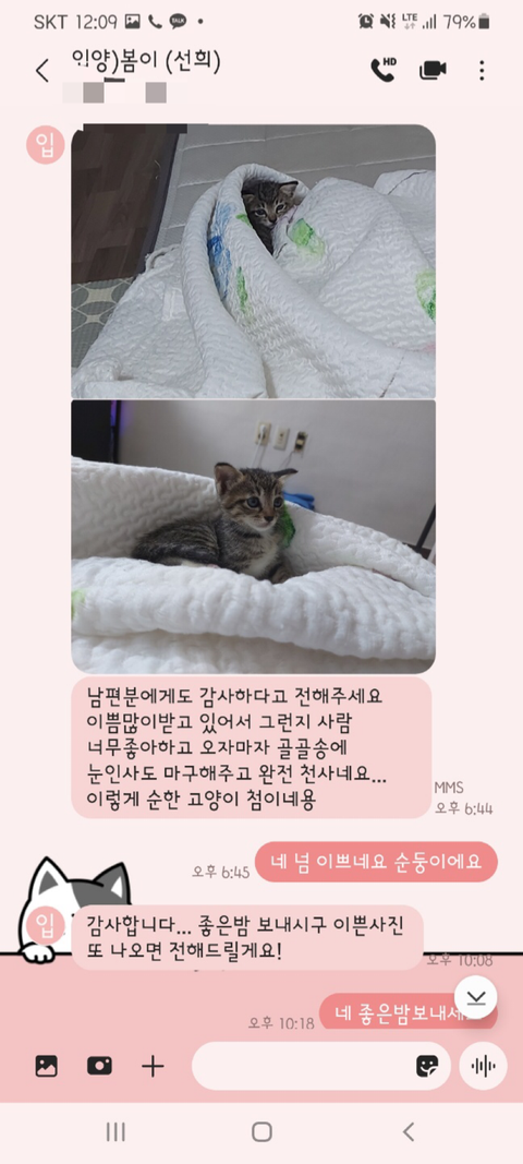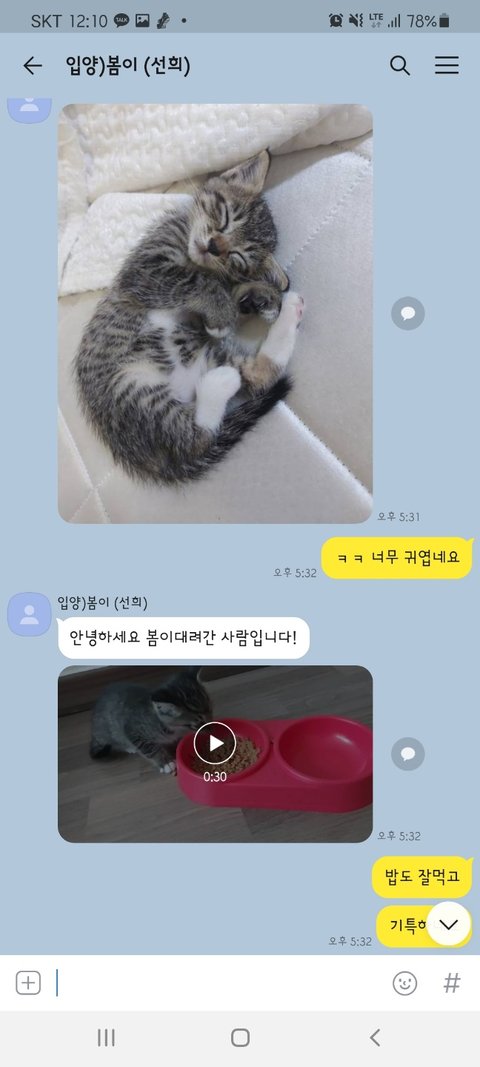 그동안 사진 찍어서 보내는 걸 깜빡했다면서 고양이가 살이 찌며 건강해지고 있고 다음 주에 1차 접종 맞으러 간다고 했었습니다.