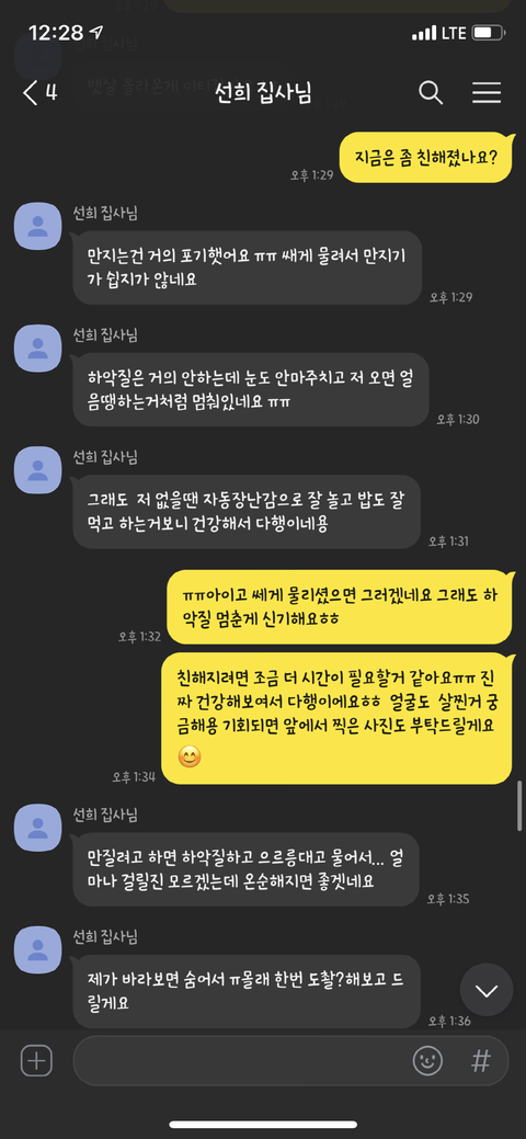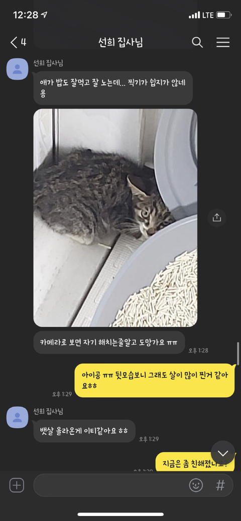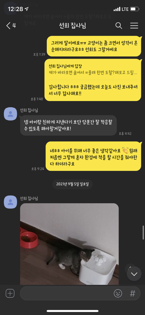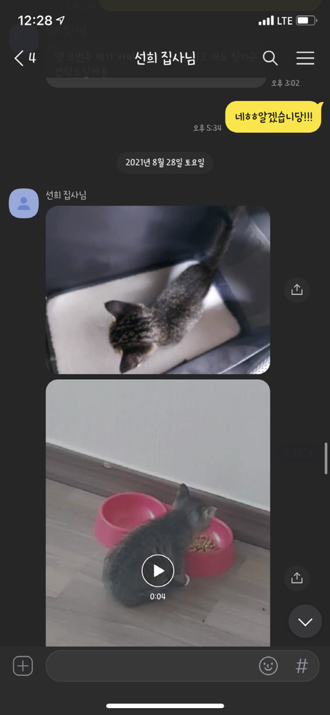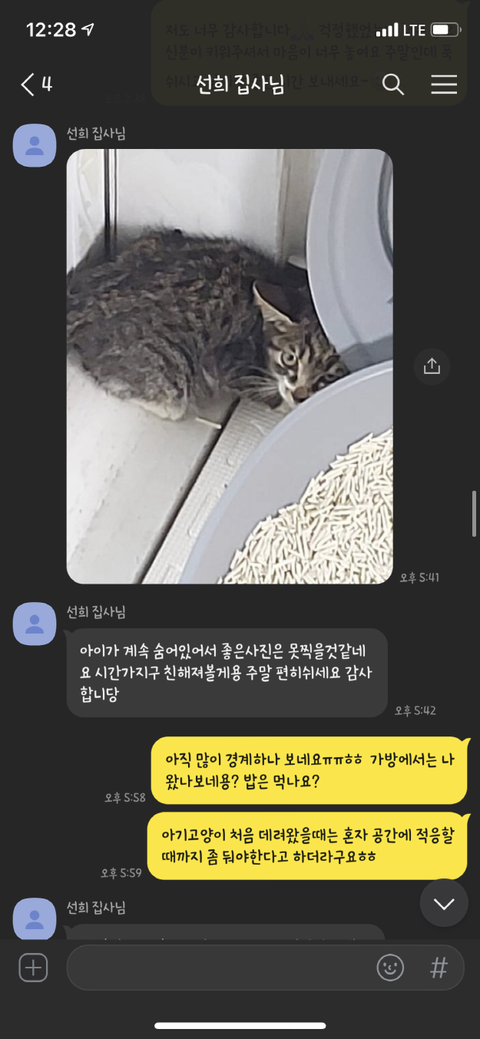 이틀 뒤 고양이가 잘 적응하고 있는지 물어봤지만 고양이에게 물려서 무서워서 사진을 못 찍겠다며 그 뒤로 고양이의 뒷모습 사진과 동영상만 보내왔습니다.