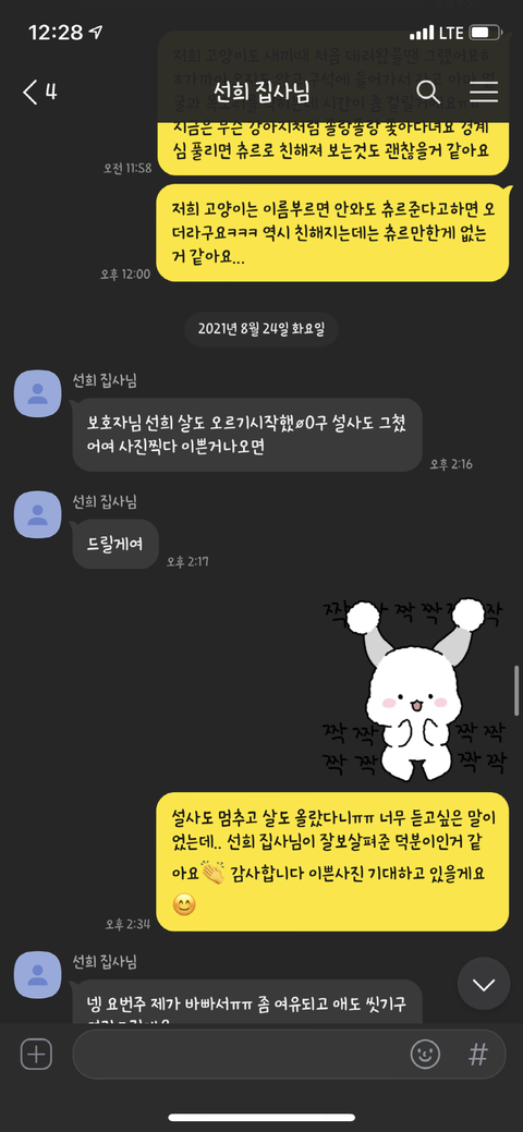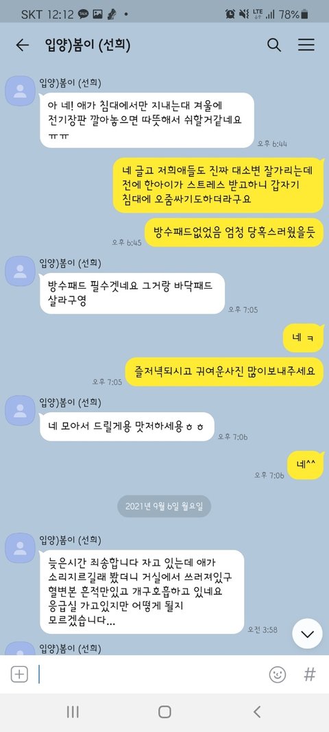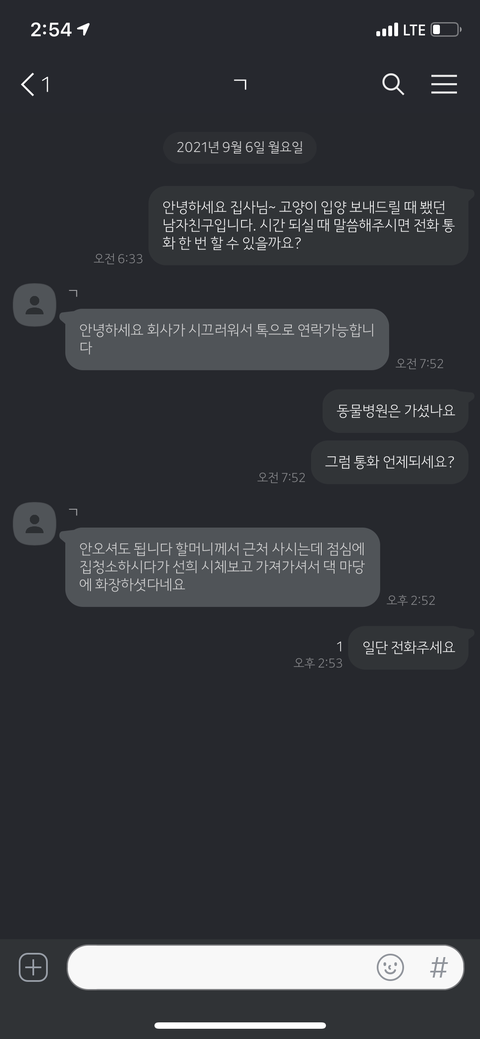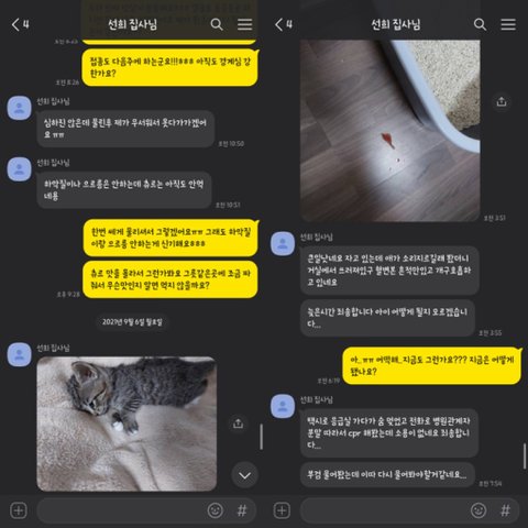 그 이후로도 간간이 먼저 고양이가 잘 지내고 있다고 연락이 왔고, 정말 치밀하고 계획적인 건 고양이가 죽었다고 연락 오기 전날 새벽 2시에도 늦은 시간에 죄송하다며 연락이 왔습니다.