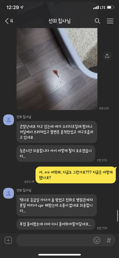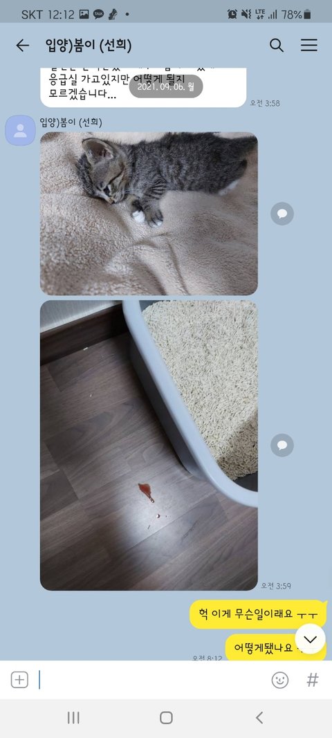 근데 사진이 아무리 봐도 저희 고양이 같지가 않아서 제가 찍었던 사진과 비교를 해보니 무늬가 달랐습니다. 그때부터 조금 이상함을 느꼈고 아침에 깨서 어떻게 됐냐고 물으니 "택시 타고 응급실 가다가 숨이 멎었고 병원 관계자 말에 따라 cpr을 시도해 봤는데 소용이 없었다며 부검을 물어봤는데 다시 물어봐야 할 것 같다."라고 대답하였습니다.