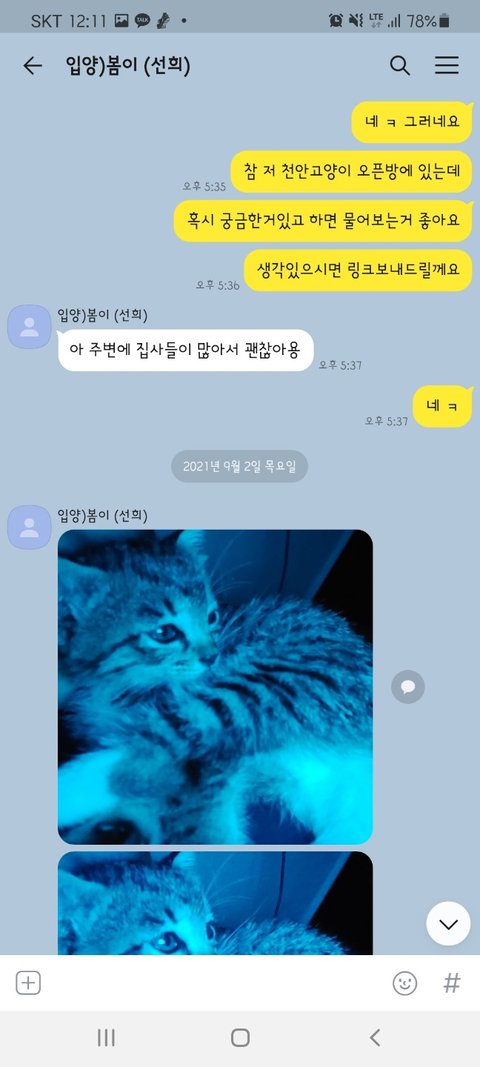 그분께서는 아시는 분께서 천안에 이런 사건이 있다며 네이트판 링크를 보내주셔서 제가 올린 글을 보게 되셨고, 읽다가 본인이 겪었던 일과 너무 비슷하다고 느끼던 중 제가 올린 카톡 대화 사진과 고양이 사진을 보고 놀라셨다고 합니다.